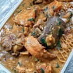 With Goat meat, hard chicken, stockfish, catfish fillets, smoked fish, Ponmo)